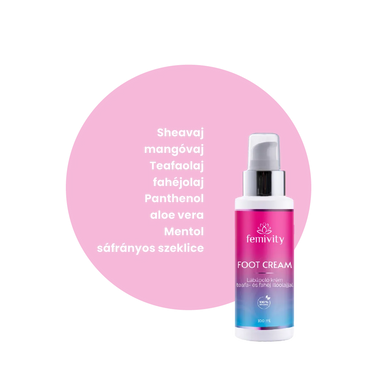 A Femivity Foot Cream nyugtató és antibakteriális hatású lábápoló krém teafa illetve fahéj illóolajjal, sáfrányos szeklicével, shea- és mangóvajjal ápolja az igénybevett száraz bőrt, lábkörmöket és a felrepedt sarkakat.